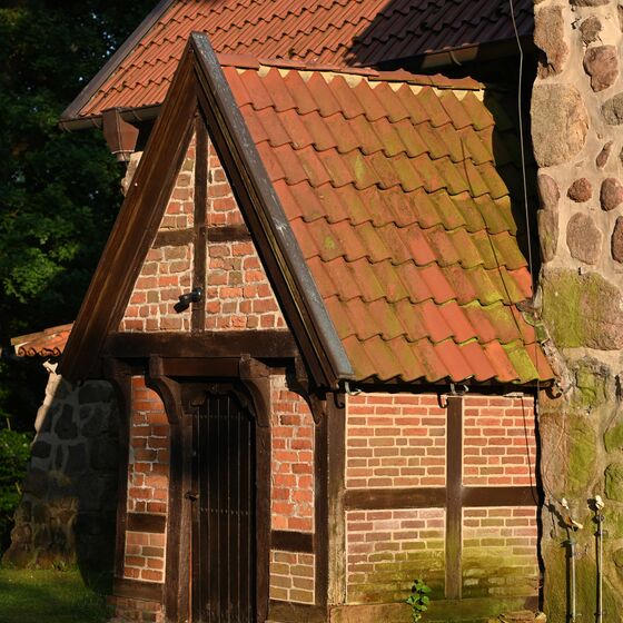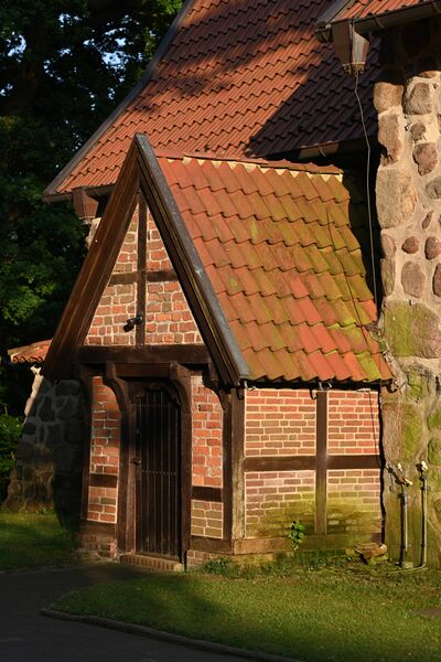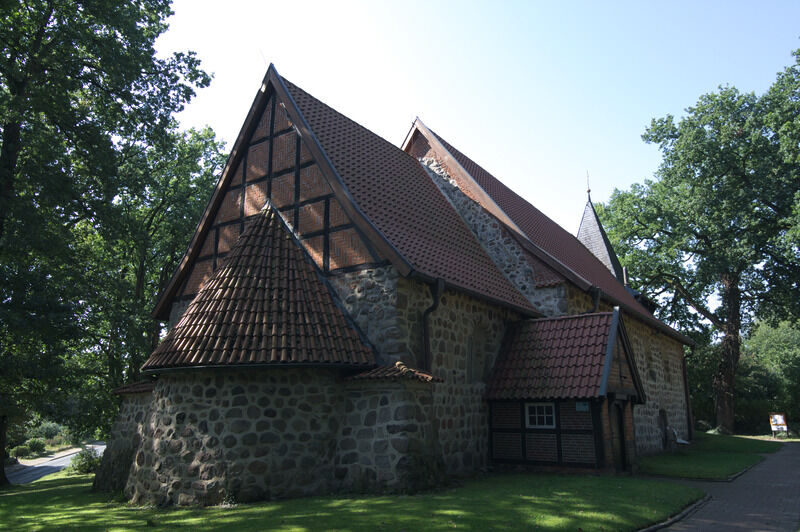 Besucher berührt noch heute die Ausstrahlung der Katharinenkirche von Kraft und Würde. An ihrer Nordwand errichteten die Bliedersdorfer um 1700 ein Brauthaus aus Eichenfachwerk. An der Westseite fanden die von Horneburger Adelsfamilien gestifteten Glocken („Marienglocke“ 1444 und „Friedensglocke“ 1625) im vorgelagerten, wuchtig quadratischen Holzturm (1708) ihren Platz. Wer auf seiner Reise eine kleine Rast einlegen und zur Ruhe kommen möchte, der muss sich erst einmal etwas bücken: Vor rund 780 Jahren waren die Menschen viel kleiner und so ist die Eingangstür zur dreigeteilten Kirche (Langschiff, Chor und Apsis) auch nur 1,65 m hoch.
