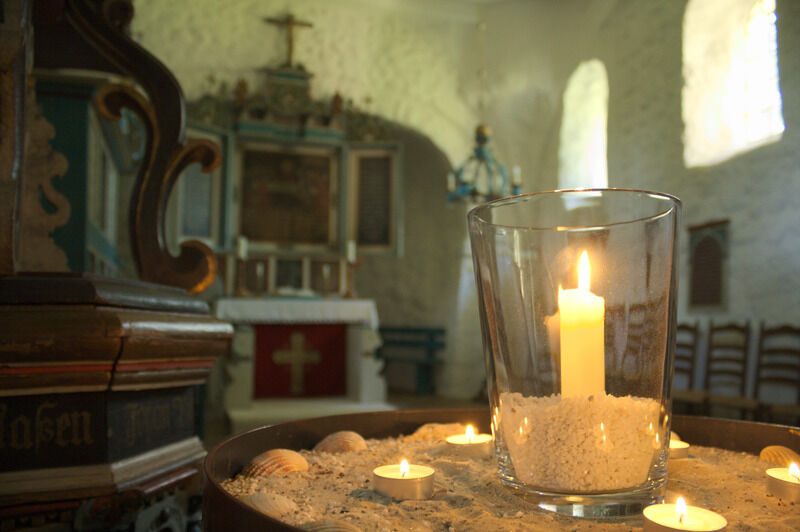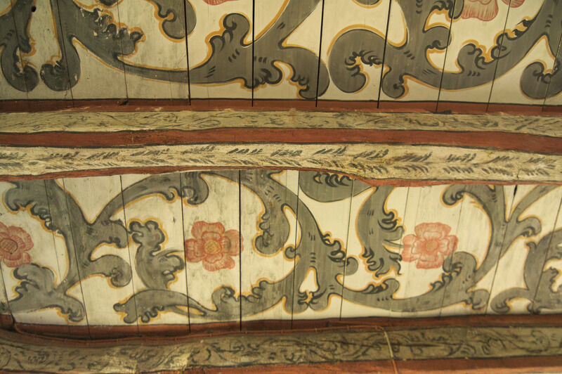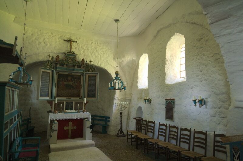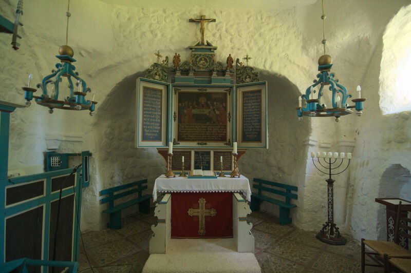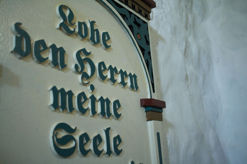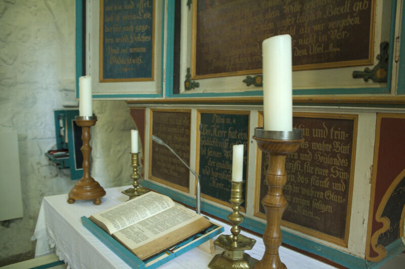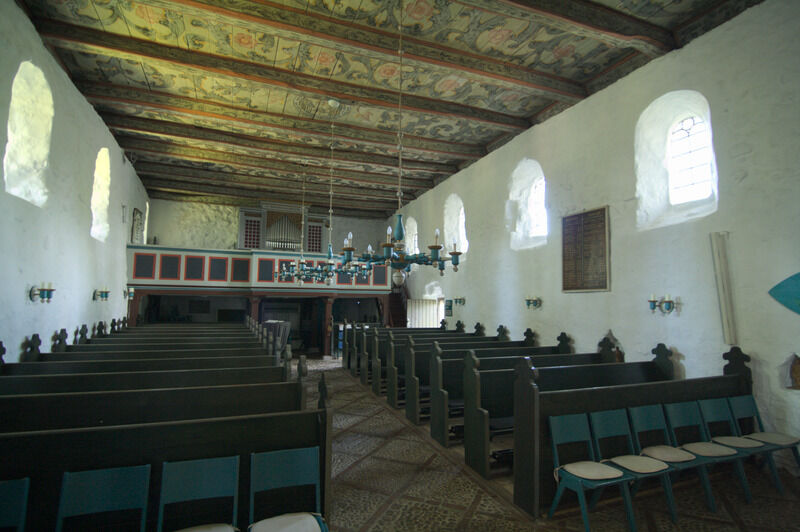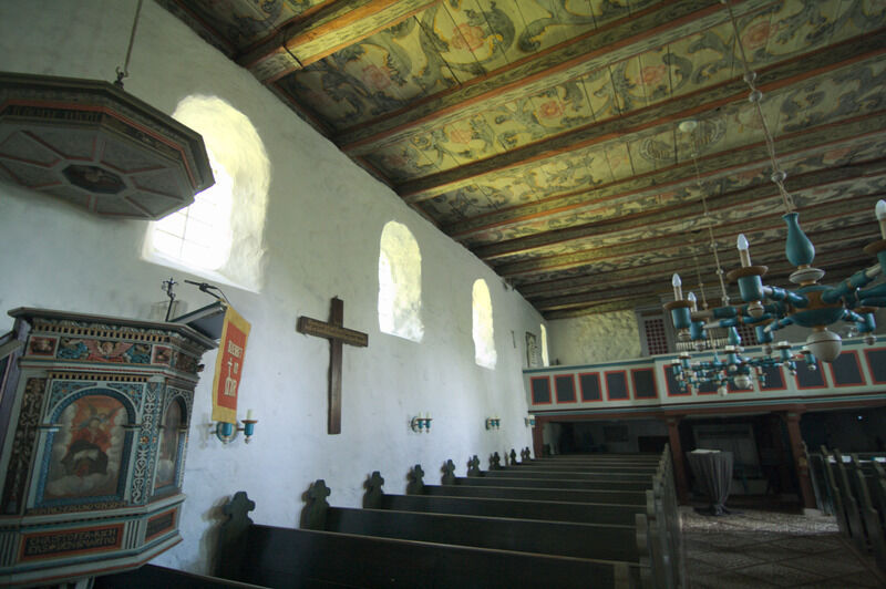 Das Innere der Kirche ist schlicht und im Stil der Renaissance und des Barock, entsprechend den Fähigkeiten der Menschen im Ort, doch kunstvoll zugleich. Besonderes Ausstattungsstück ist die Kanzel aus dem Jahre 1622 und das Taufbecken von 1696. Vielleicht lehnen Sie sich etwas zurück und lassen Ihren Blick Richtung Himmel wandern? Die Kirchendecke wurde um 1800 vom damaligen Schulmeister "Lehrer Sanny" bemalt. Neben reichen Ranken und Rosen halten Engelfrau und Engelmann ein Medaillon, das das Auge Gottes im Paradies darstellt.